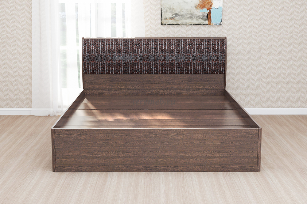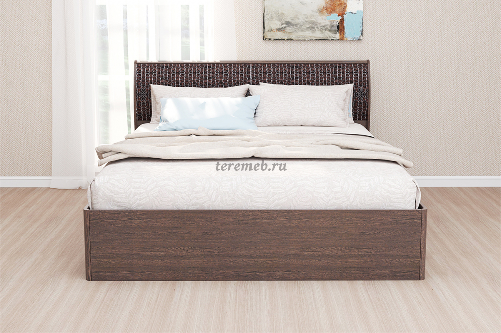 Головная спинка отделана высокачественной экокожей с тиснением под рептилию и погонажным рамочным профилем из МДФ, покрытого финиш-плёнкой, что придаёт необычность и оригинальный внешний вид этой модели.