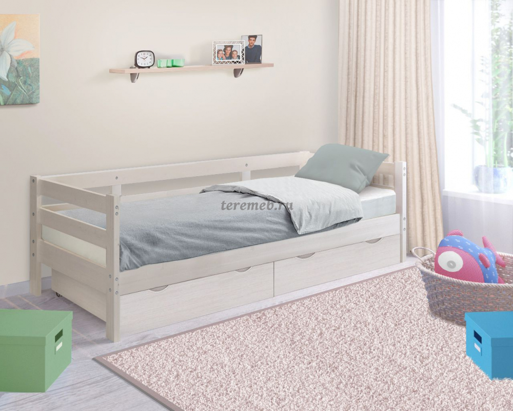 Кровать имеет два больших выдвижных ящика для белья. Вместо ручек ящики имеют выемки на лицевой части для безопасности и удобства открывания.