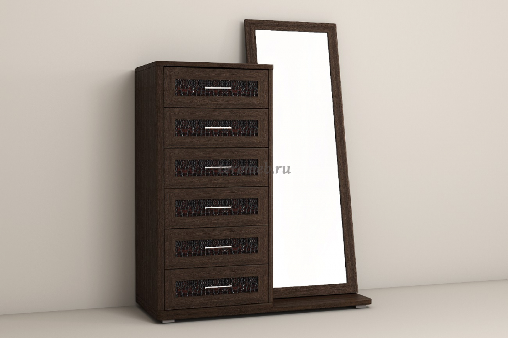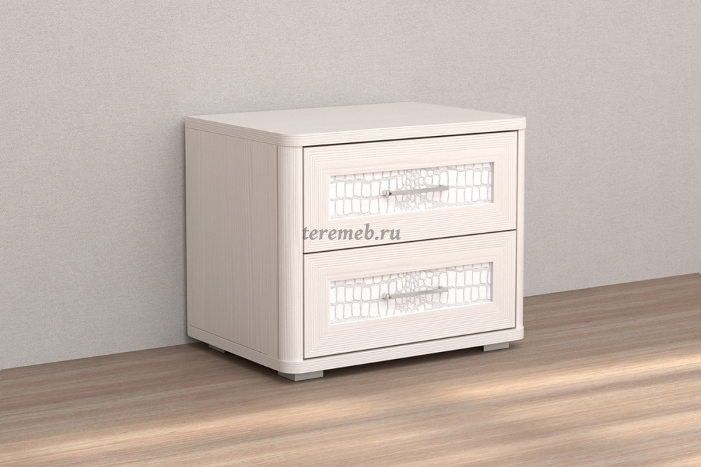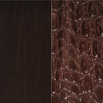 Фасады ящиков отделаны высокачественной искусственной кожей с тиснением под рептилию и погонажного рамочного профиля МДФ, покрытого финиш-плёнкой, что придаёт необычность и оригинальный внешний вид этой мебели.