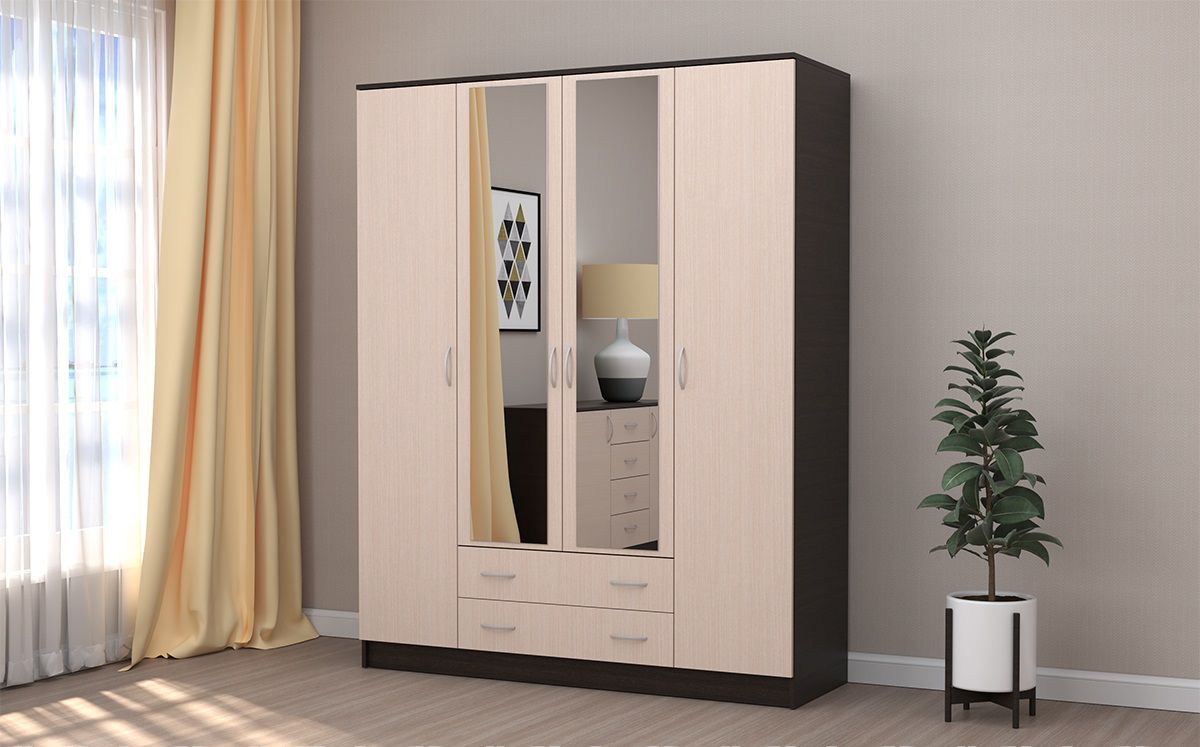 Функциональная конструкция 4-х дверного шкафа распашного типа. В спальне ему также отводится важное место. В одной части можно хранить одежду на вешалках, в другом – на полках.