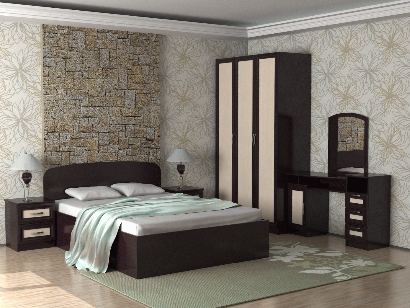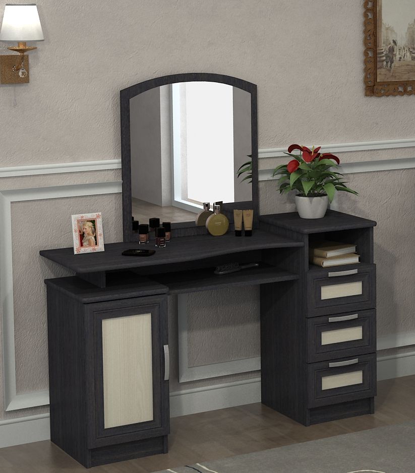 На оригинальной столешнице с фигурным вырезом установлен щит с большим зеркалом, наклеенным в заводских условиях. Стол имеет две тумбы: одна с распашной дверью, в другой три выдвижных ящика на роликовых направляющих. В нишах под столешницей можно хранить журналы, косметику и другие нужные мелочи.