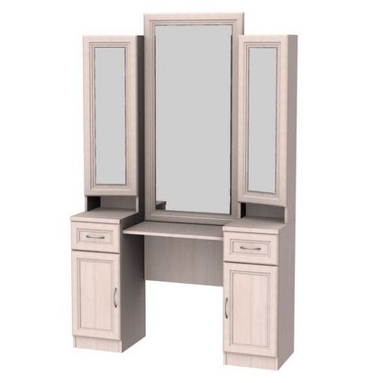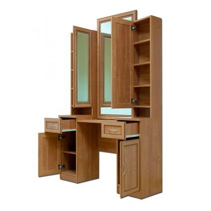 Большое центральное зеркало обрамляют два небольших узких зеркала, наклеенные на створчатые двери, за которыми находятся отделения с тремя полками в каждой для косметики, парфюмерии, украшений. Толщина зеркал 4 мм.