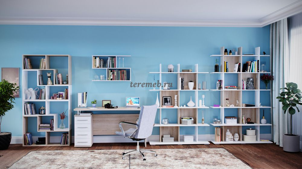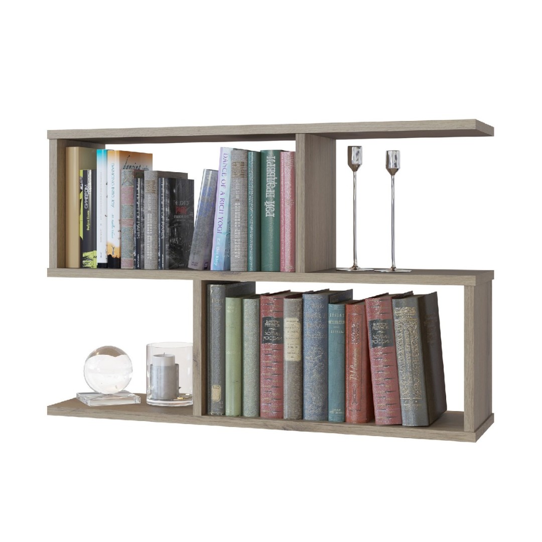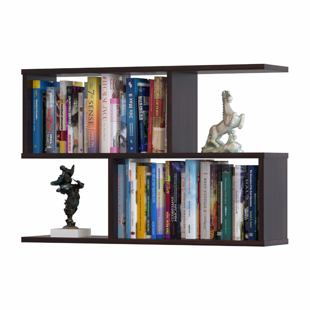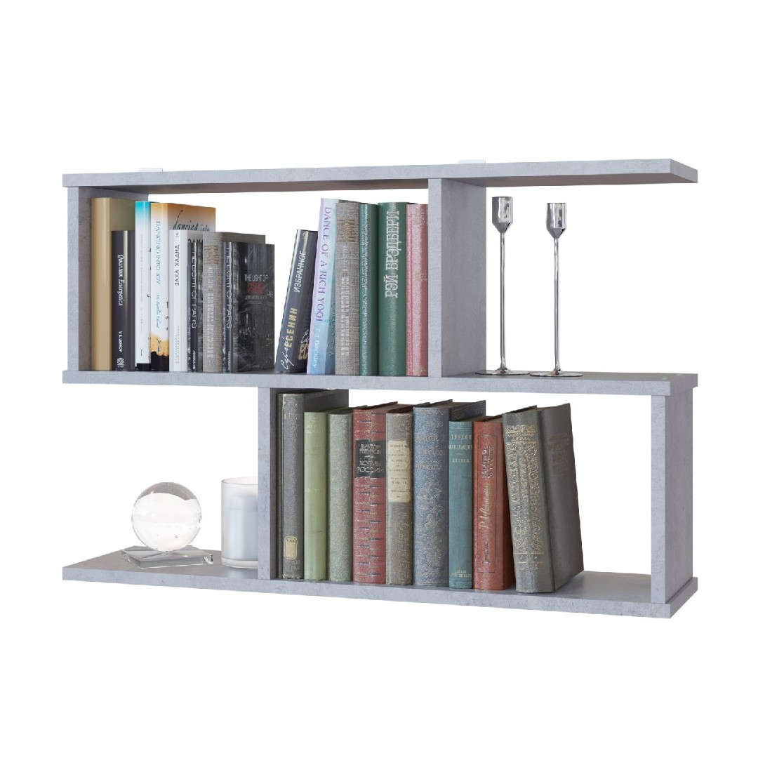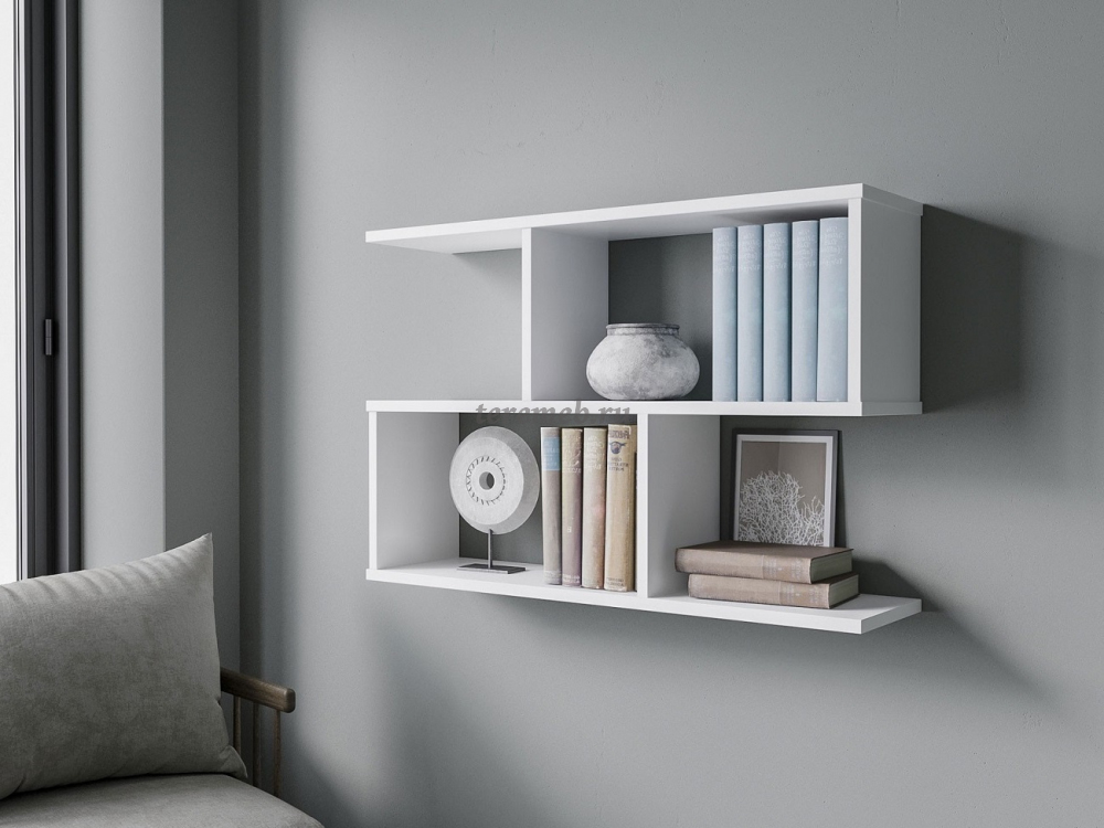 Полка имеет четыре отсека. Ниши со стенками прекрасно подходят для хранения книг, а открытые полки делают полку визуально легче.