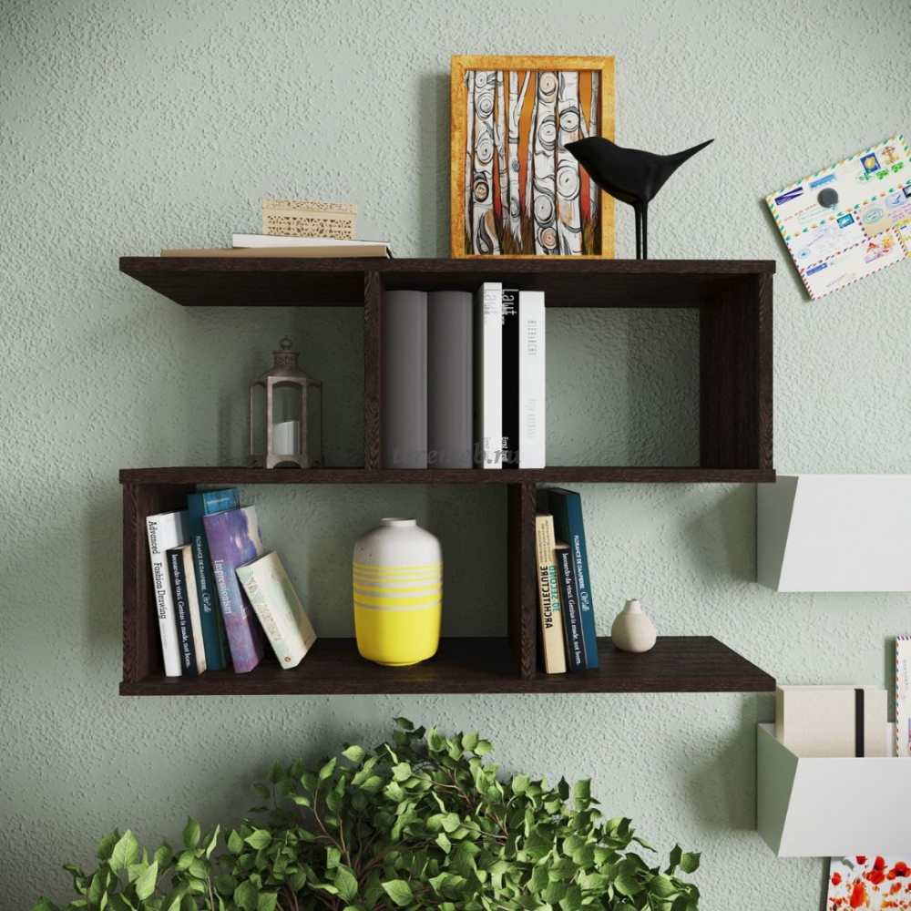 Полка имеет четыре отсека. Ниши со стенками прекрасно подходят для хранения книг, а открытые полки делают полку визуально легче.