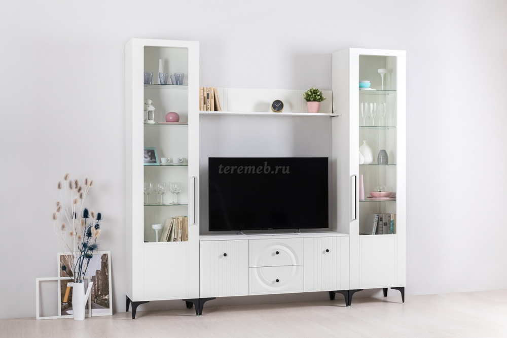 Задняя стенка изготовлены из современного МДФ белого цвета с декоративным профильным узором.