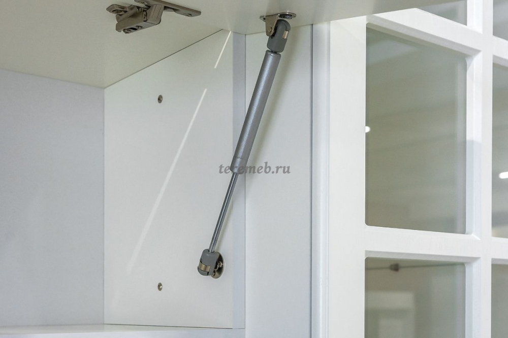 Фасады шкафа установлены на 4-х шарнирных петлях и оборудованы подъёмным механизмом на газовых амортизаторах.