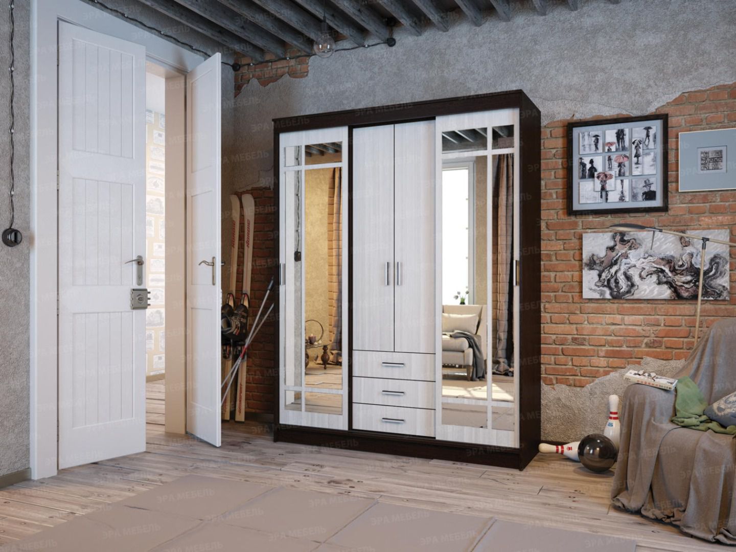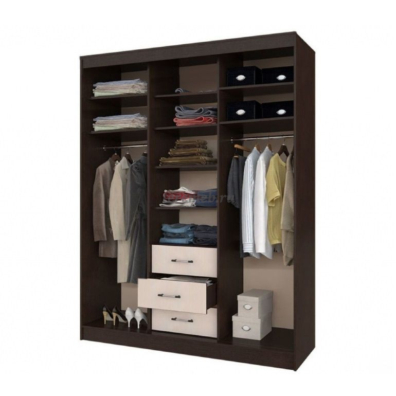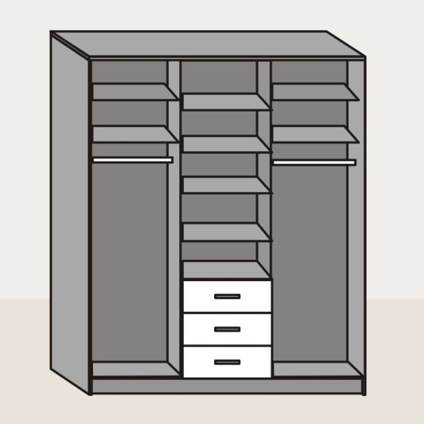 Слева и справа за дверями-купе с зеркалами симметричные отделения с двумя верхними антресольными полками, под ними металлическая горизонтальная штанга.