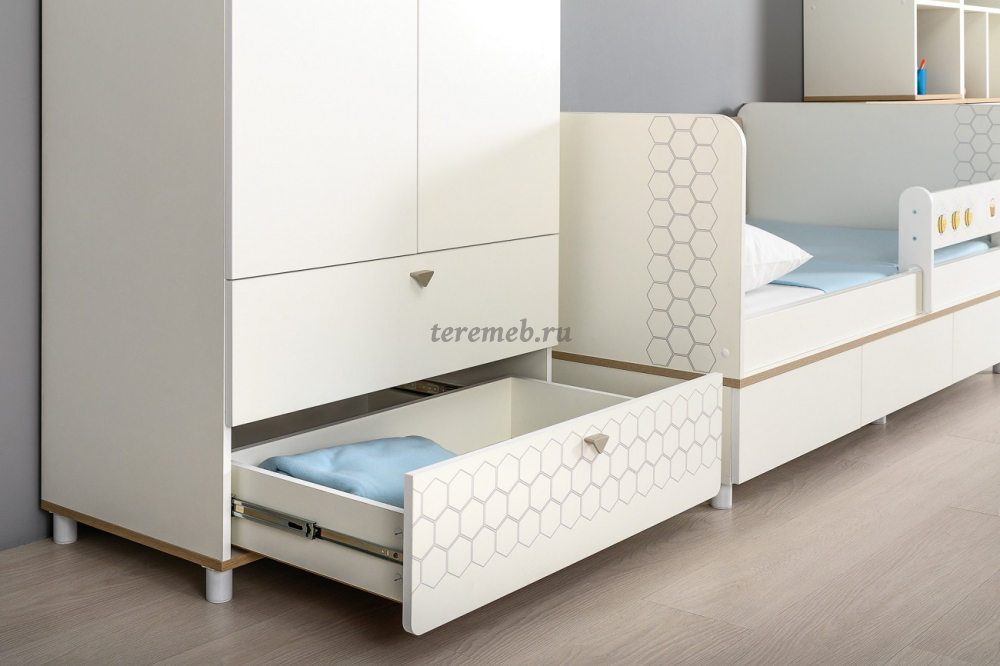 Изготовлен из высококачественного ламинированого ДСП толщиной 16 мм классом эмиссии Е-1, что соответствует нормативам, принятым при изготовлении мебели для детских комнат.