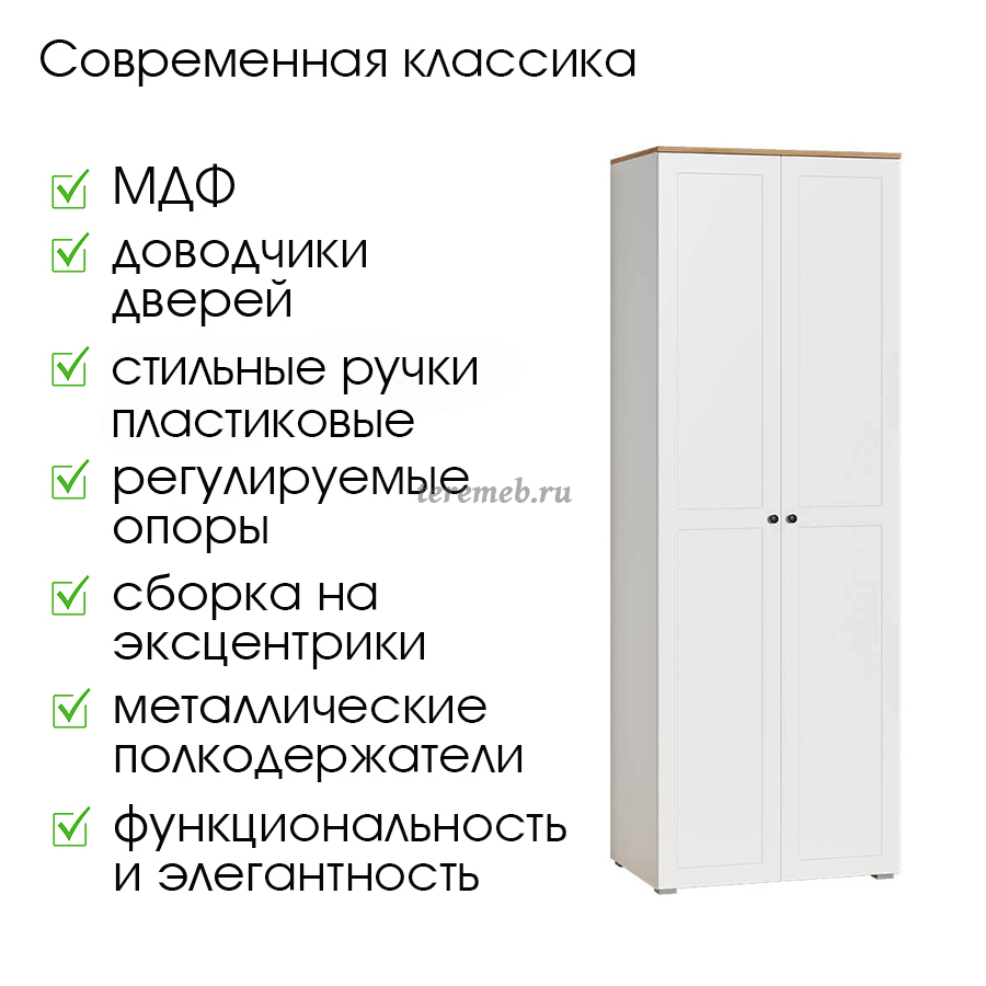 Шкаф 2-х дверный "Остин 16.307" доступен в современном комбинированном цветовом решении – белый в сочетании с тёплым древесным декором и может быть использован как дополнительный элемент к модульной гостиной "Остин" или как самостоятельный предмет интерьера.