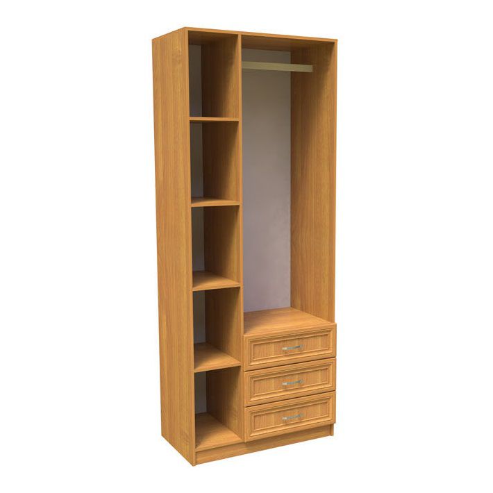 Справа за двумя распашными дверями находится горизонтальная металлическая штанга для размещения одежды. Три выдвижных ящика установлены на роликовые направляющие. Размеры ящиков (ДхГхВ): 510 х 480 х 140 мм.