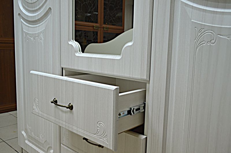 В центральной части находится четыре отделения для белья с тремя полками и три выдвижных ящика на шариковых направляющих.